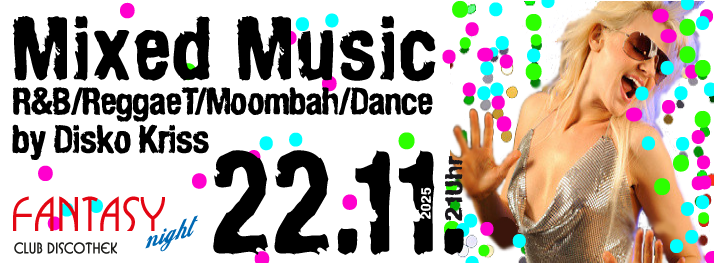 Mixed Music Mixed Dance/HOuse/Pop/R&B/Reggaeton/Moombah by Disko Kriss + Zu Google Kalender hinzufügen + iCal / Outlook export Datum Nov. 22 - 23 2025 Uhrzeit 21:00 - 04:00